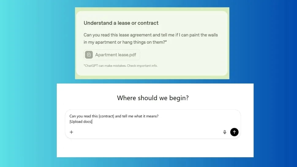 وقتی اولین آپارتمانم را اجاره کردم، دلم می‌خواست ChatGPT وجود داشت! اصطلاحات حقوقی و بندهای کوچک قرارداد واقعاً گیج‌کننده‌اند. حتی حالا که صاحب‌خانه‌ام، ChatGPT در درک قراردادهای بزرگ کمک زیادی می‌کند. کافی است روی پرامپت کلیک کنید، قرارداد را آپلود کنید و ChatGPT آن را به زبانی ساده و قابل‌فهم برایتان توضیح می‌دهد.