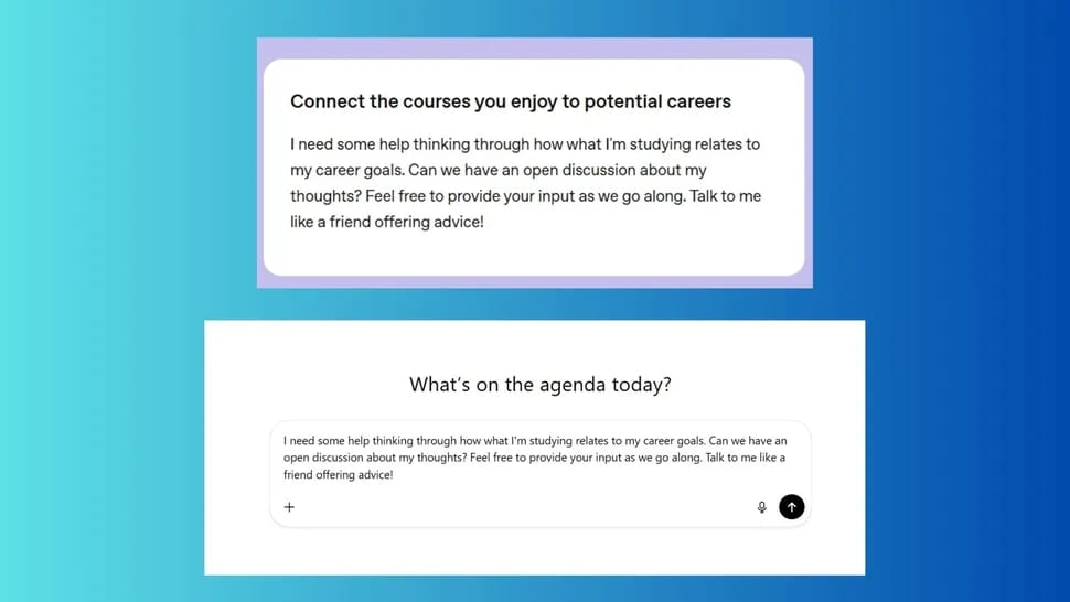 اکنون می‌توانید این وظیفه را به ChatGPT بسپارید. کافی است دوره‌های تحصیلی خود را توصیف کنید (یا حتی بهتر، سیلابس درسی‌تان را آپلود کنید) تا ChatGPT شغل‌هایی متناسب با علایق شما پیشنهاد دهد.
