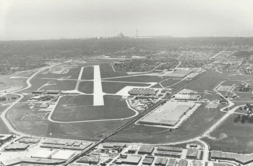 داونزویو نزدیک به یک قرن پیش بهعنوان یک باند پرواز ساده میان زمینهای کشاورزی شکل گرفت و بعدها به مرکز فعالیت شرکت هوافضایی De Havilland Canada تبدیل شد. در دوران جنگ جهانی دوم، این فرودگاه نقشی کلیدی در تولید هواپیماهای نظامی داشت و در دهه ۱۹۹۰ نیز توسط شرکت بمباردیه خریداری شد. با جابهجایی این شرکت، فرودگاه در سال ۲۰۲۴ تعطیل شد، اما این پایان داستان نبود.