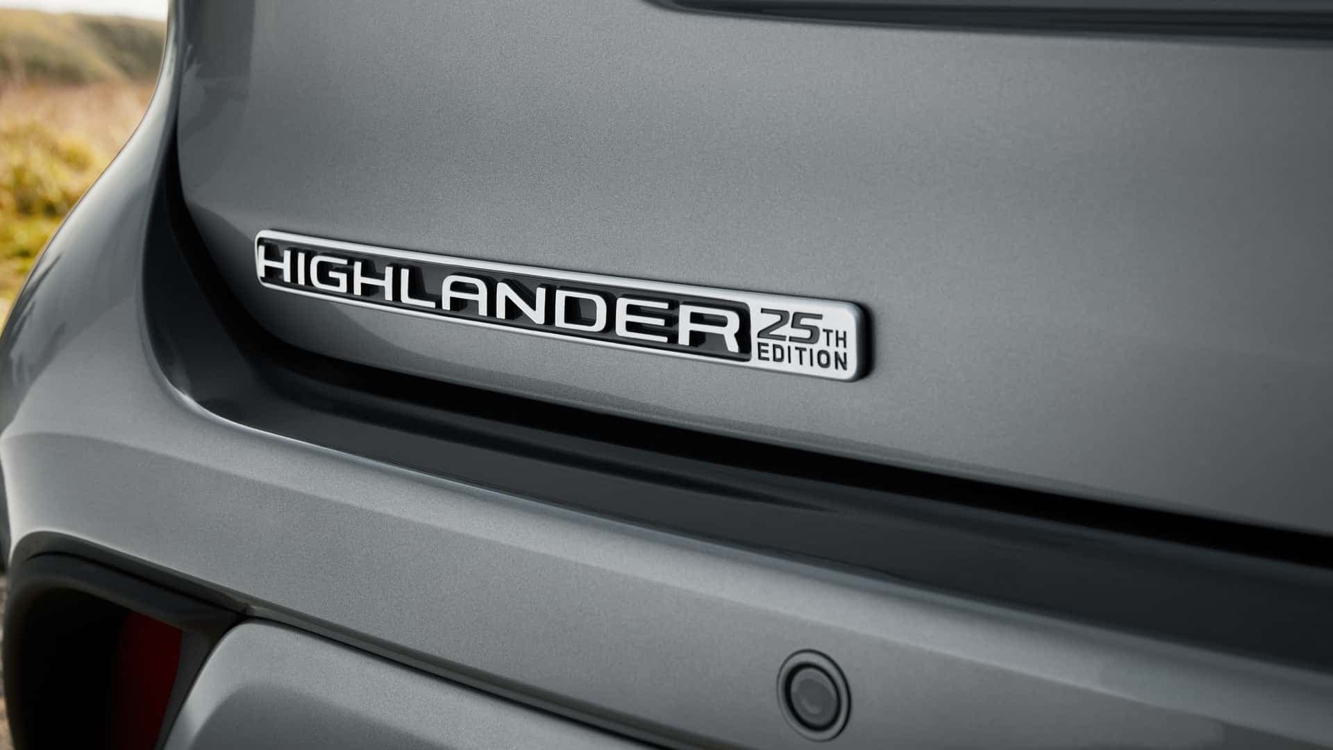 مدل ویژه 25th Edition همان شکل آشنای هایلندر را دارد، اما تزئینات نقرهای در دو طرف خودرو به آن اضافه شده و بخشهای پایینی سپرهای جلو و عقب نیز با تزئینات نقرهای مزین شدهاند. این خودرو روی چرخهای ۲۰ اینچی ویژهای قرار گرفته و در دو رنگ خاکستری یا سفید عرضه میشود. اگر این جزئیات را متوجه نشدید، به دنبال یک نشان مخصوص 25th Edition در درب عقب خودرو باشید.