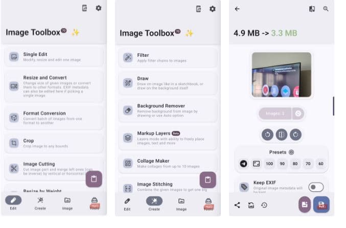 با Image Toolbox میتوانید حجم تصاویر را بهصورت دقیق کاهش دهید، فرمت فایلها را تغییر دهید، عکسها را با اندازه مشخص resize کنید و حتی اطلاعات EXIF را حذف یا ویرایش کنید؛ آن هم بدون افت محسوس کیفیت. این برنامه برای کارهایی مثل چسباندن چند تصویر به هم، ساخت کلاژ، افزودن واترمارک و پردازش گروهی عکسها فوقالعاده کاربردی است.