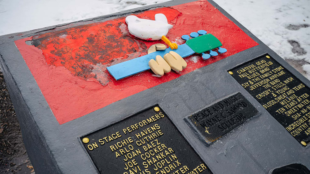 من و عکاس، دیو برنت، در مرکز هنرهای بتل وودز، که اکنون یک سالن کنسرت در محل مزرعه یاسگور است، ملاقات کردیم. یک بنای یادبود در این محل قرار دارد که مشرف به تپهای است که زمانی محل استیج اصلی فستیوال بود. در این روز سرد فوریه، تپه پوشیده از برف بود و کسی یک علامت صلح روی آن کشیده بود.