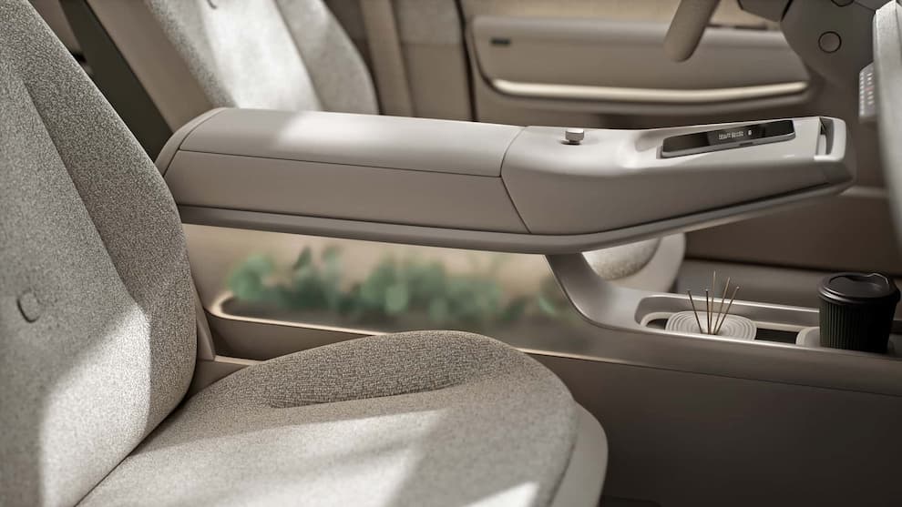 در بخش کنسول میانی، یک پیچ چرخشی پیش از پد شارژ بیسیم دوگانه قرار دارد. پایینتر از آن، جایگاه نگهدارنده لیوان و تزئینات طبیعی با برگهای اوکالیپتوس واقعی دیده میشود.