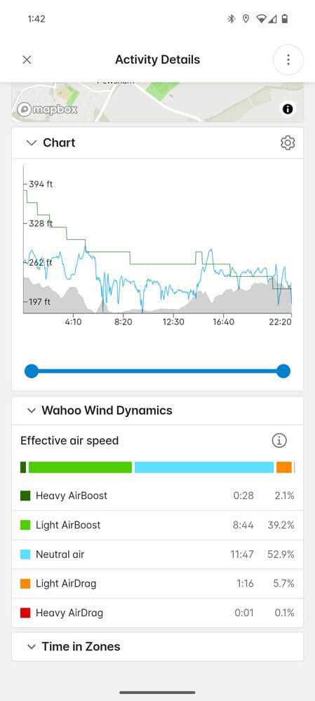 سینکسازی مبتنی بر ابر Wahoo کاملاً بدون نقص است. تا زمانی که دوچرخه را قفل میکردم و گوشی را بیرون میآوردم، دادههای سواری با جزئیات کامل از جمله بخشهای صعودی و اطلاعات مهم مقاومت باد در اپلیکیشن همراه نمایش داده میشد. از آنجایی که بیشتر دوچرخهسواری من در شرایط هوای مناسب است، باید بپذیرم که این ویژگی دیدگاه جدیدی درباره بهبود یا افت عملکرد به من نداد. اما کسانی که بهطور منظم مسافتهای طولانی طی میکنند، قطعاً به تأثیر شرایط باد یا حرکت در پشت سر دیگر دوچرخهسواران علاقهمند خواهند بود.