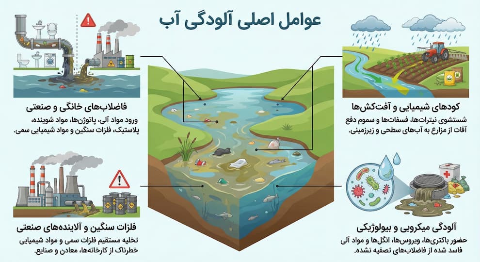 منابع آلودگی آب بسیار متنوع هستند و از هر دو منشا طبیعی و انسانی ناشی میشوند. در محیطهای شهری و خانگی، تعدادی از عوامل کلیدی به طور مستقیم بر کیفیت آب تأثیر میگذارند؛ شناخت و درک صحیح این عوامل برای حفاظت از سلامتی امری مهم محسوب میشود.