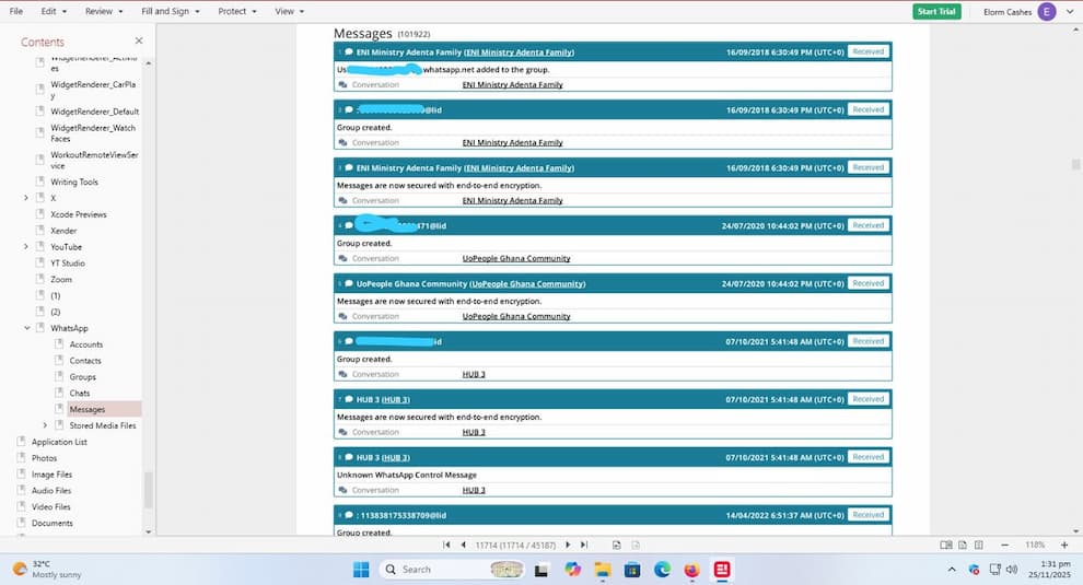 دنیل علاوهبر پیامهای خصوصی، به متادیتای گروههای واتساپ نیز اشاره کرد. طبق یافتههای او، واتساپ اطلاعاتی مانند موارد زیر را ذخیره میکند:
