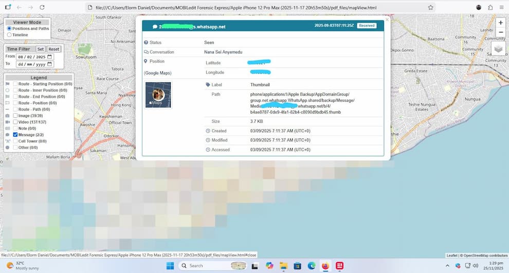 بر اساس یافتههای دنیل، گوشیهای هوشمند – بهخصوص آیفون – هنگام ثبت عکس، ویدیو یا اسکرینشات، مختصات GPS را بهصورت خودکار ذخیره میکنند. این مختصات ممکن است بعدها در بررسیهای تخصصی استخراج شود.
