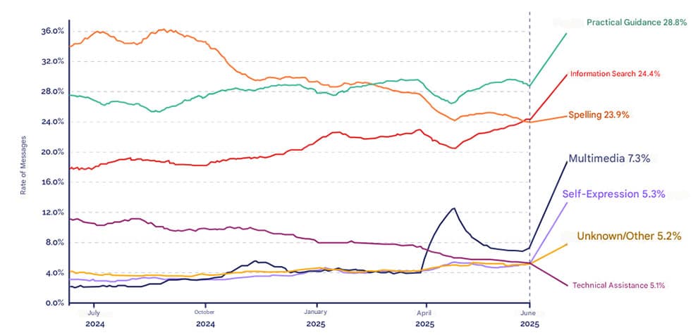 بر اساس دادههای نوامبر ۲۰۲۲ تا سپتامبر ۲۰۲۵، گفتوگوهای کاربران ChatGPT عمدتاً در سه محور اصلی متمرکز بوده است: