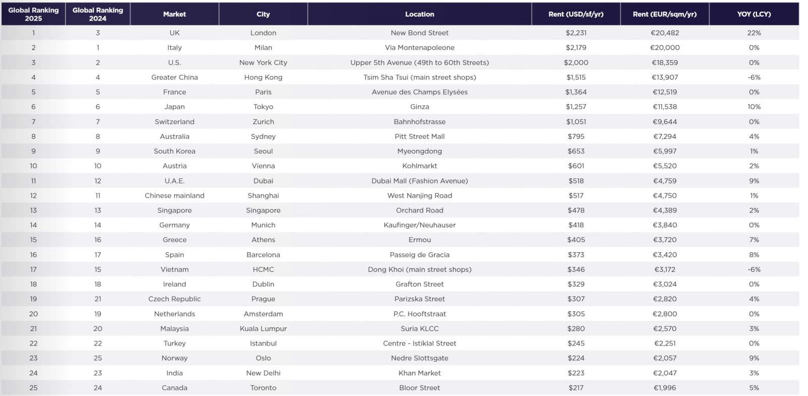 گزارش امسال نشان میدهد که خیابان New Bond Street در لندن برای نخستینبار عنوان گرانترین مقصد خردهفروشی جهان را از آن خود کرده است. این خیابان که سال گذشته تنها در یک سال 22 درصد رشد قیمت را تجربه کرده بود، اکنون به 20 هزار و 482 یورو اجاره سالانه بهازای هر مترمربع رسیده است.