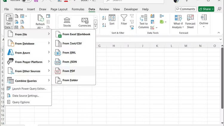 ۲. روی دکمه Get Data بزنید و به بخش From File رفته و سپس از منوی زیرین نیز گزینه From PDF را انتخاب کنید.
